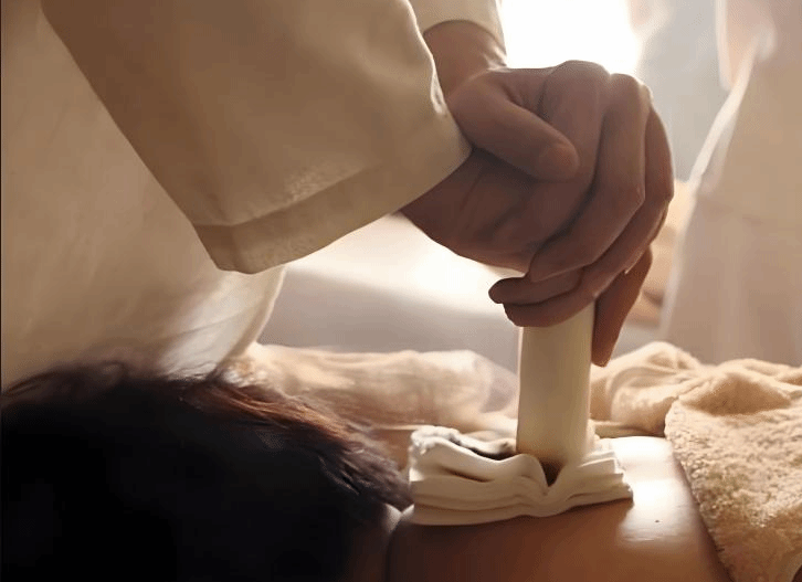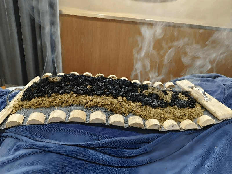 操作前需准备陈艾绒、生姜、附子、肉桂等,辨证调配。先将生姜或大蒜捣泥,铺于脊柱及两侧;阳虚重症可加铺附子、肉桂等药粉。再铺 2-3 厘米厚长条状艾绒,点燃一端或两端,患者觉灼热时可添艾绒或移敷料调温防灼伤。