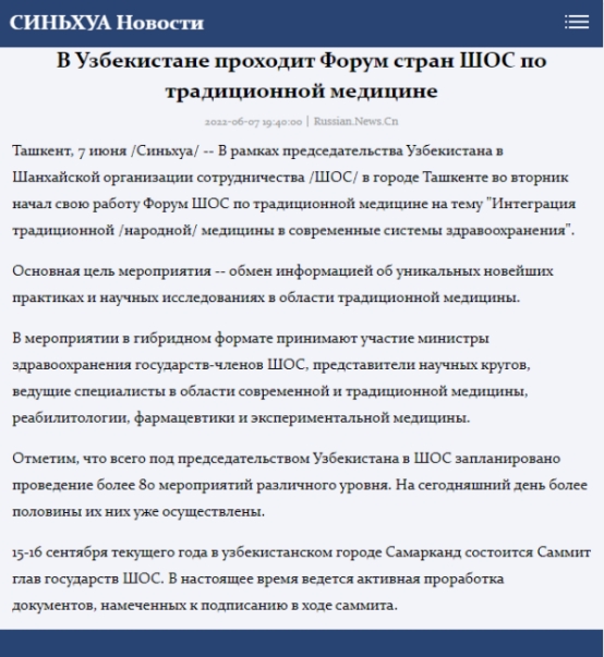 主题为“将传统(民间)医学融入现代卫生体系”的上合组织传统医学论坛于2022年6月7日在塔什干举行。