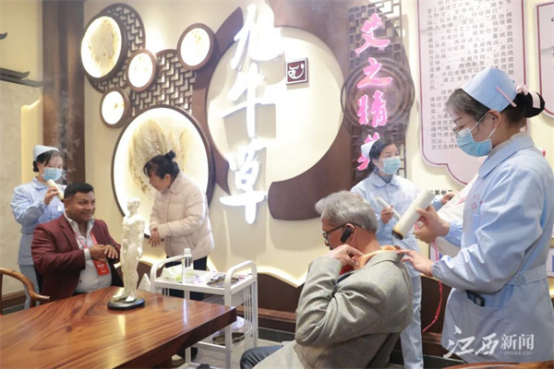 参加2023上海合作组织传统医学论坛的外国嘉宾在樟帮中医药一条街体验九牛草艾灸