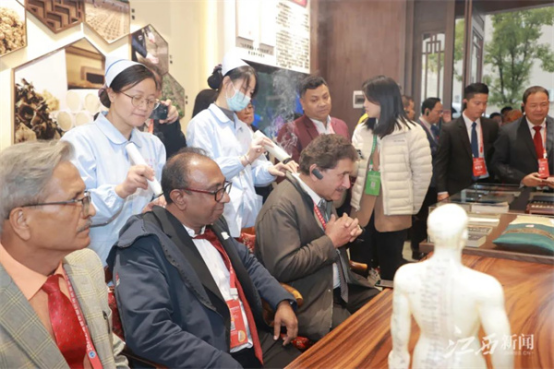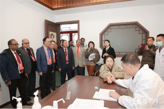 参加2023上海合作组织传统医学论坛的外国嘉宾在樟帮中医药一条街观摩中医诊疗服务