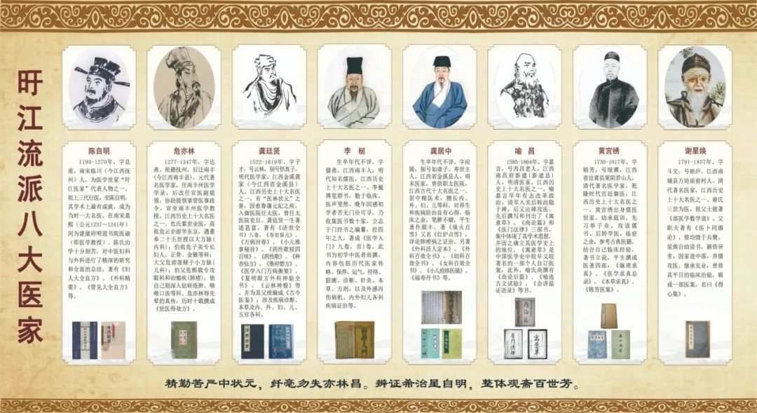 据地方志及医学史记载,仅宋、元、明、清四代,旴江流域各县,有传略可考的医学家多达两百余人,医学著作约一百余种,其中流传后世,对我国医学发展影响较大的有:南宋临川妇产科专家陈自明,著有《妇人大全良方》、《外科精要》、《管见大全良方》等书。元代南丰骨伤科专家危亦林,著有《世医得效方》。明代金溪“医林状元”龚廷贤,著有《万病回春》、《寿世保元》等十多种医书;另有一位擅长治疗痨瘵的专家龚居中,也是金溪人,著有《红炉点雪》、《福寿丹书》、《小儿痘疹医镜》等书;还有一位热心普及医学教育的李梴是南丰人,著有《医学入门》。清代有关于追求真理的宜黄人黄宫绣,著有《医学求真录》、《脉理求真》、《本草求真》等书;南城人谢星焕,是一位医术精湛、经验丰富的临床高手,活人无算,著有《谢映庐医案》。以上都是旴江流域众多医学家中的佼佼者,他们的著作,解放后均重印出版,在广大读者中享有盛誉,对后学影响极为深远。