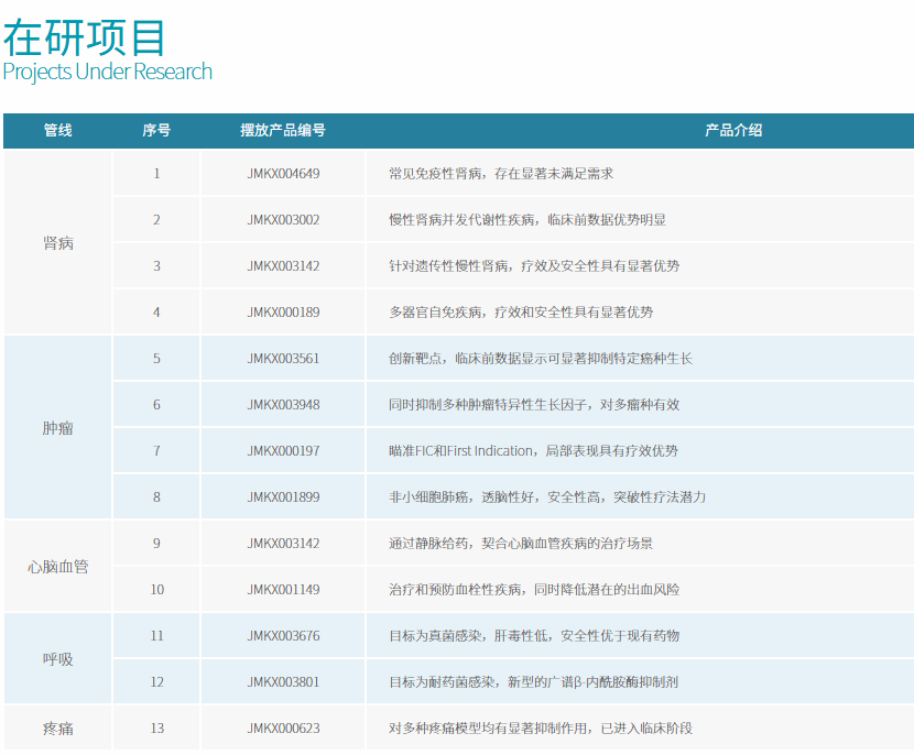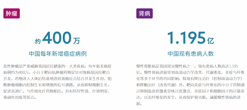 涉及肾病、肿瘤、心脑血管、呼吸、疼痛五大领域,拥有药物化学、药效学、药物代谢学、毒理安全性评价、制剂工艺开发、临床研究和中外临床申报等完善的布局,有效整合化学信息学、结构化学、计算机辅助药物设计等多项技术,打造出一个高效、智能的小分子创新药物筛选和优化平台。