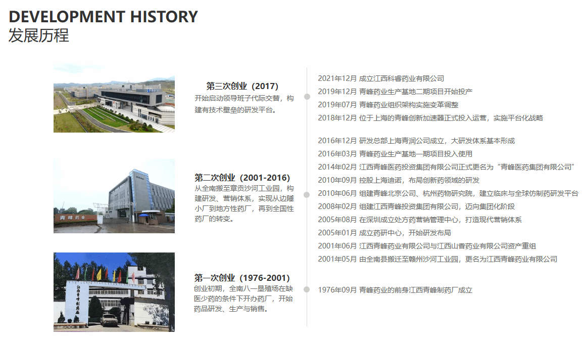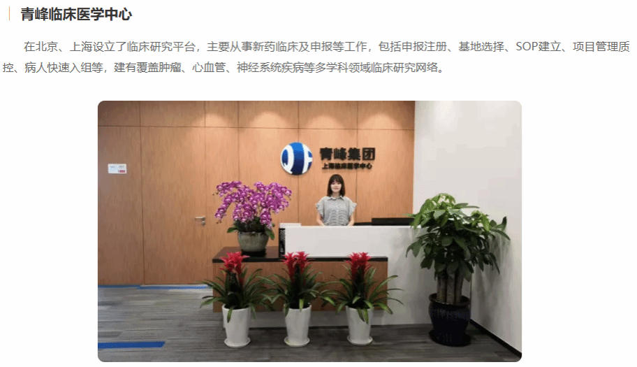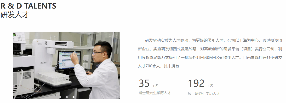 青峰医药集团以研发驱动为发展战略,每年以不低于年销售额10%的资金投入研发,在上海、北京、杭州、赣州等地打造了协同高效的化学创新药平台、高价值仿制药平台、细胞免疫平台、创新天然药物研究平台、中试转化平台及全球体量最大的Class A级别生物医药创新专业加速器,建有国家重点实验室、国家企业技术中心、国家级博士后科研工作站等高端研发平台,形成了全球化、全链条的创新研发体系,打造了医药行业开放合作的创新生态。